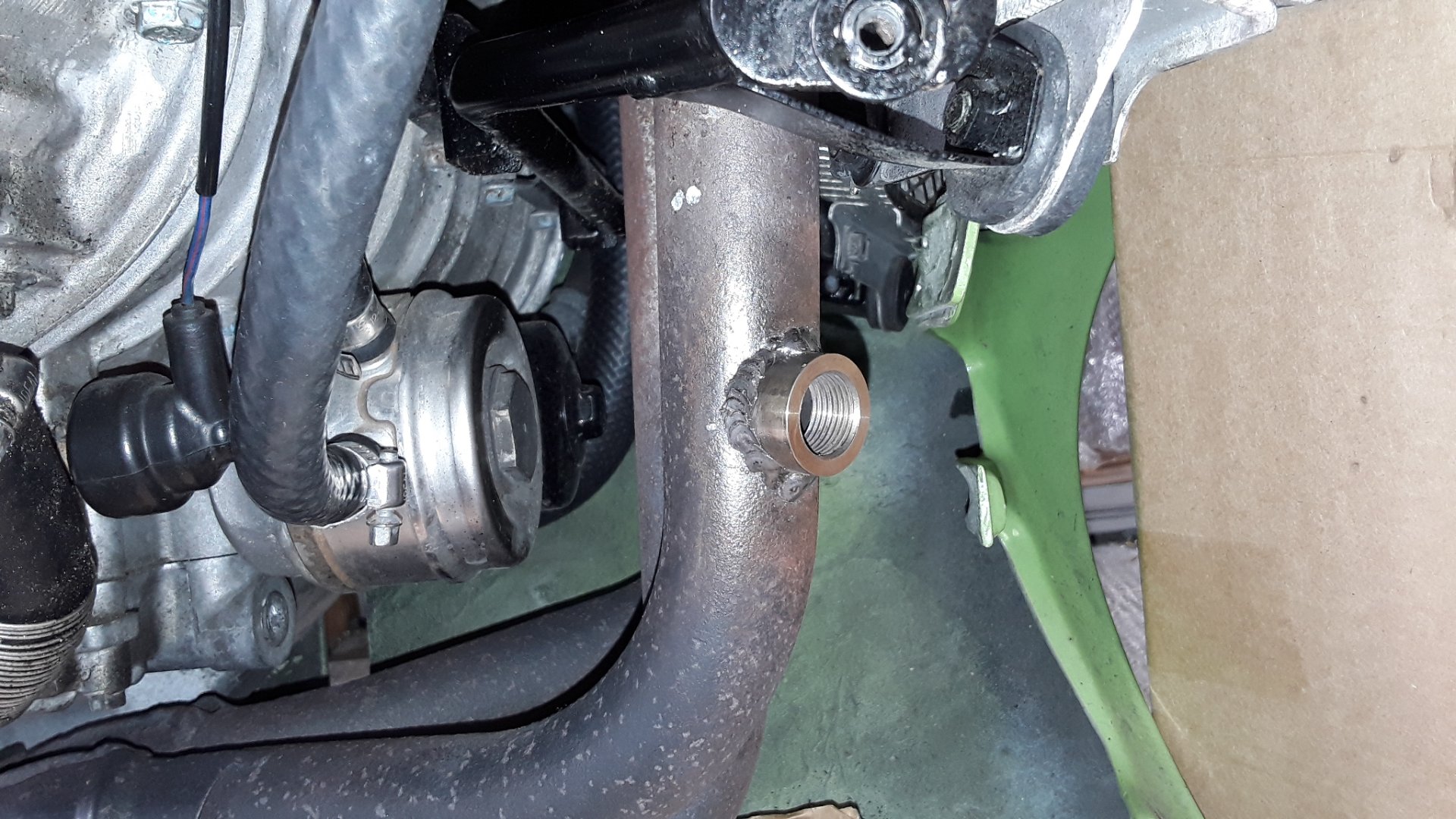 Hab am Motorrad gebohrt und geschweißt, was wegen der Pockennarbigkeit des Krümmers nicht so sauber ging, daher MAG. Beim Krümmertausch demnächst werde ich das noch ändern und versiegeln.