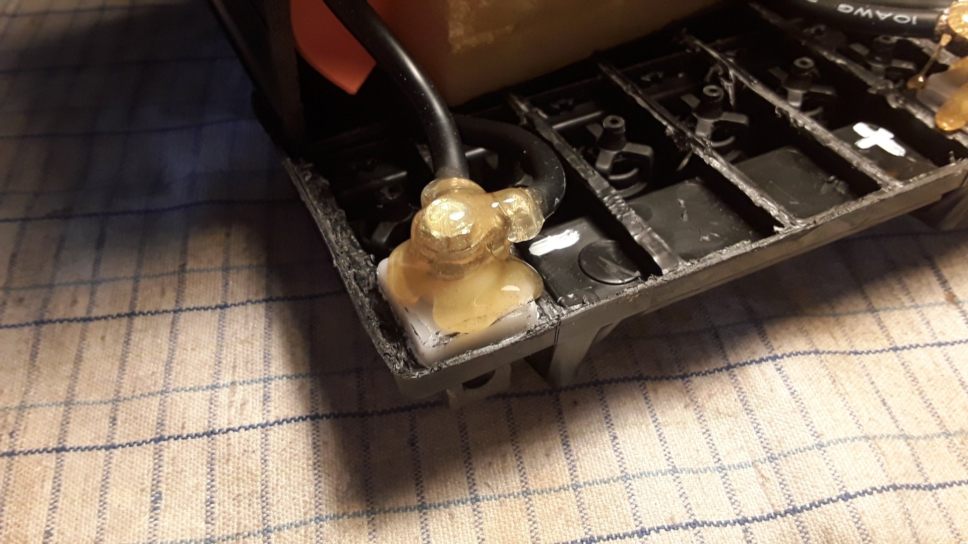 Das Gehäuse wurde ausgeschlachtet und die Batterien innen an die normalen Anschlüsse angeschraubt, verlötet und versiegelt