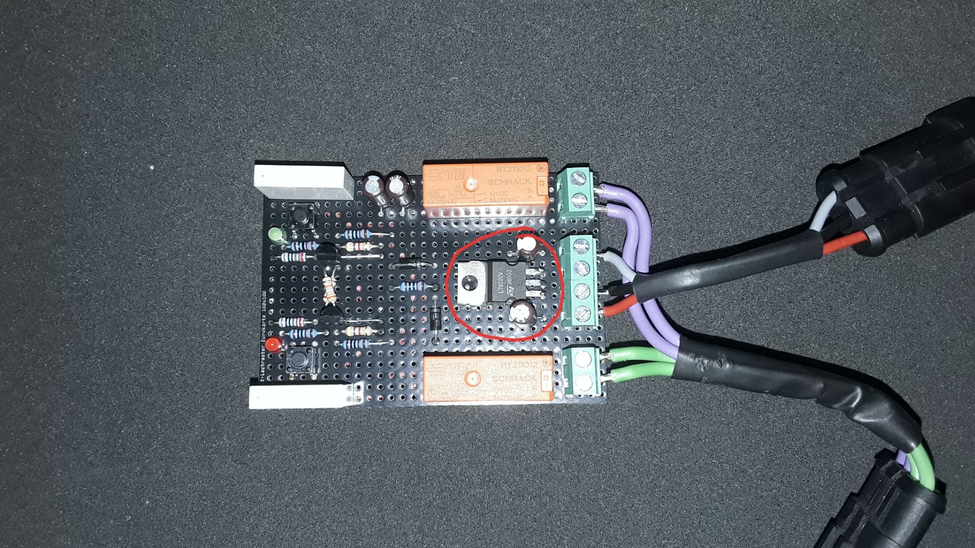 Hier sind die beiden 8A Relais zum späteren Unterbrechen der Zündspulen draufgelegt. Ohne diese wäre die jetzige Schaltung mit Impulsgeberunterbrechung etwa die halbe Größe, ca. 55x45mm.