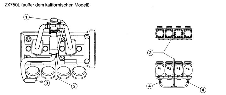 An den Gummiansaugkrümmern von Vergaser 1 und 4 geht jeweils ein Schlauch weg, welcher dann mit einem T-Stück verbunden ist und dann offen am Federbein hinunter durch die Schwinge läuft, das Ende ist also offen. Ist das so richtig?