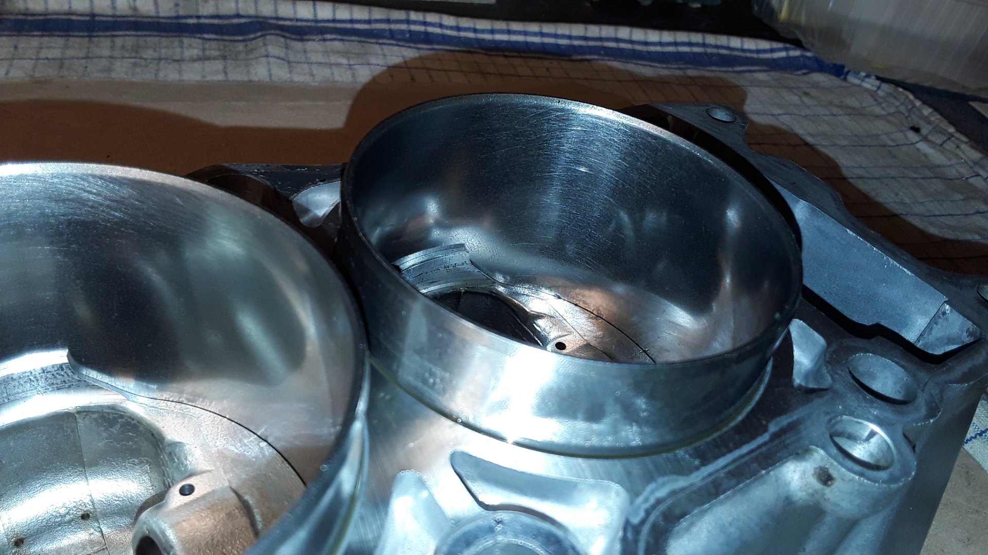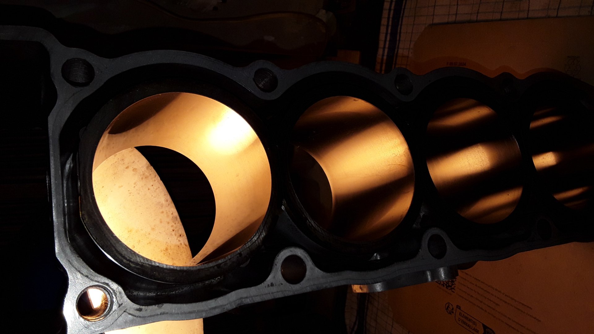 Kleinere Fase unten durch das Aufbohren Dadurch schwereres Einsetzen der Kolben mit Ringen. Aber möglich. Für den Probezusammenbau erstmal nur ein Kolbenring.