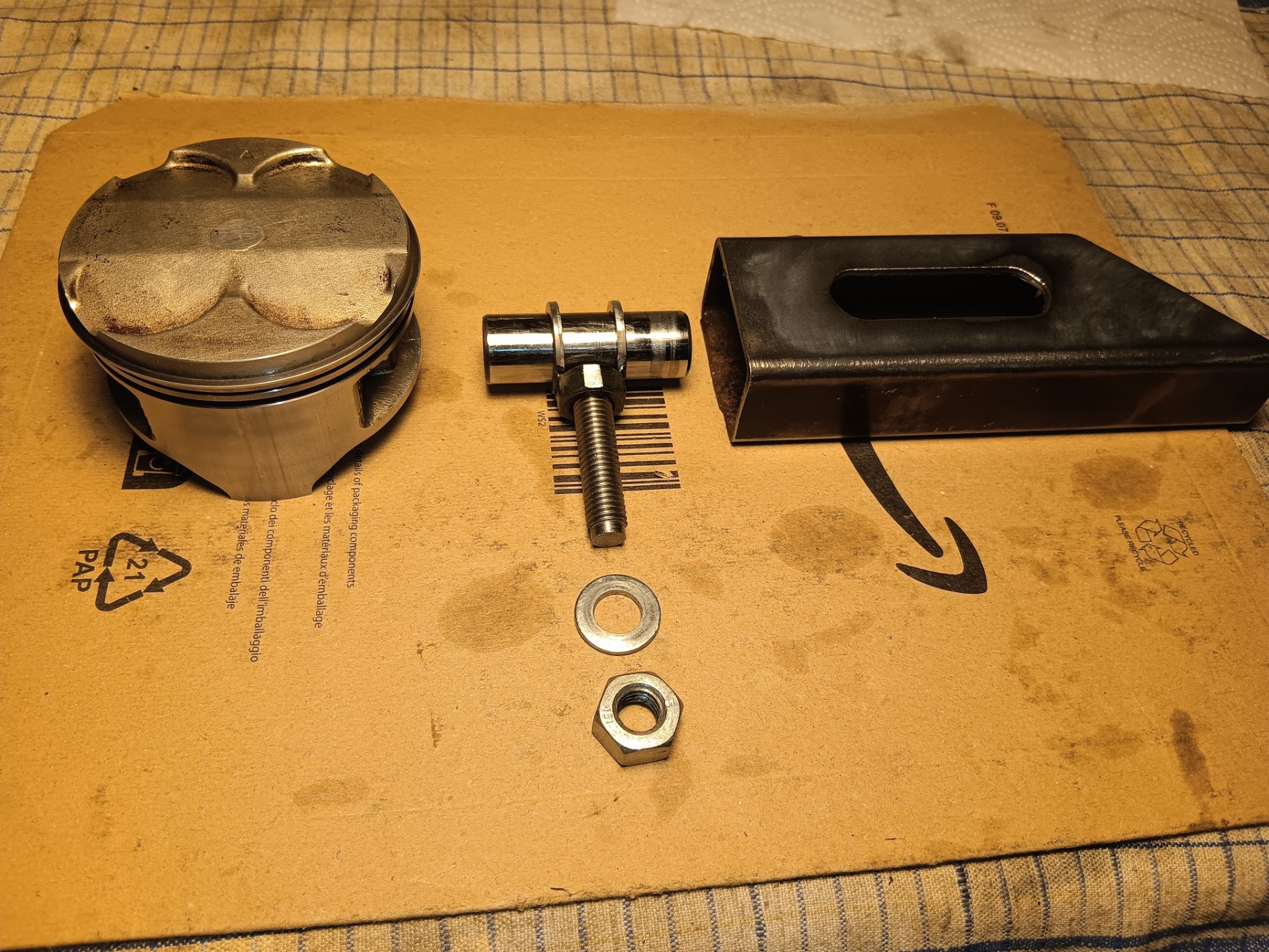 Alle Teile Schlechten Kolbenbolzen geopfert. 2 Scheiben auf 18 aufgedreht and an 10er Mutter geschweißt.