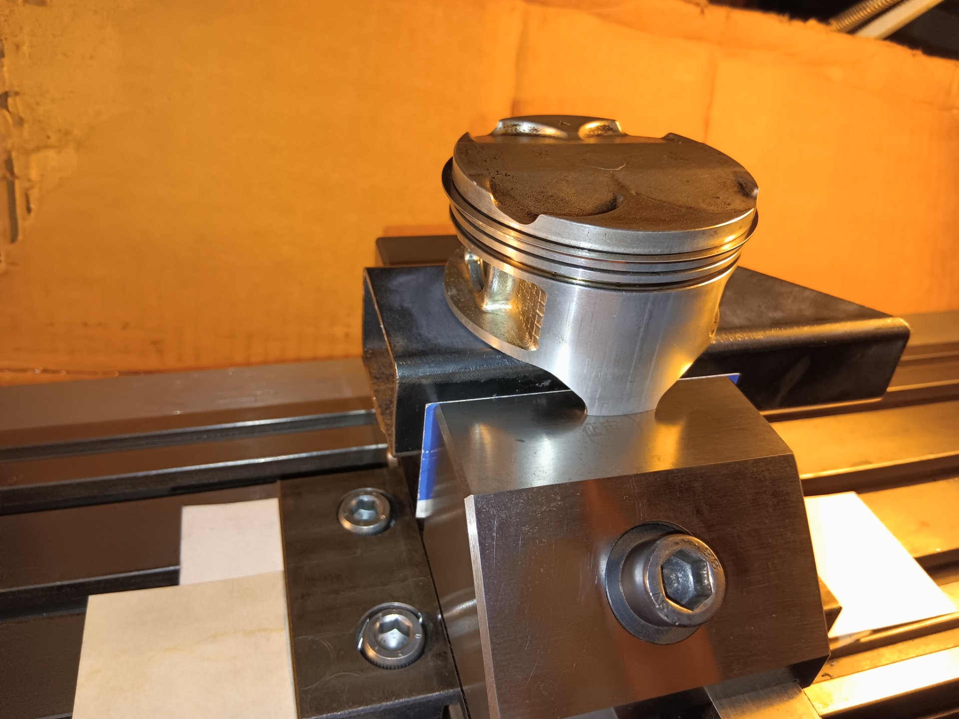 Professionelle Spannvorrichtungen drücken den Kolben über den Bolzen gegen ein Prisma. Nur einseitig, da der Kolben so kegelförmig ist. Hatte erst 2 Prismen im Schraubstock probiert, ist aber zuviel zum Ausgleichen.
