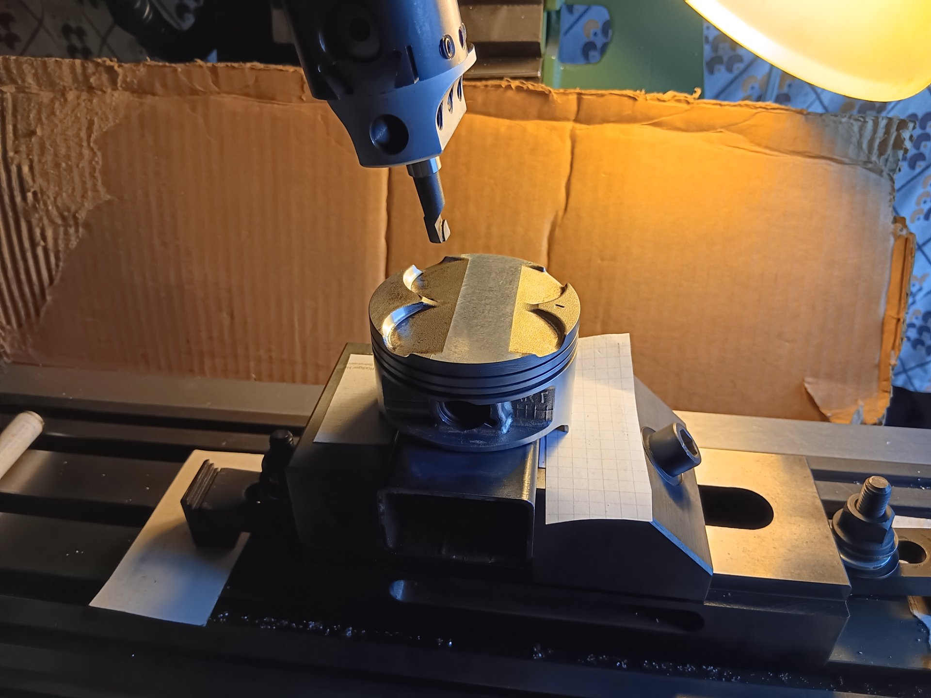Spannvorrichtung und Gleichmäßigkeit der Kolben mehr als ausreichend genau. Daher erst alle Kolben geplant. So wird der gesamte Kolbenboden abgesehen von den Taschen gleich hoch. Dadurch ringsherum die gleiche Quetschkante. Es sind ungefähr 35/100 runter.