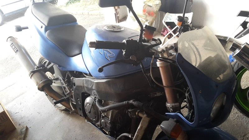 vor zwei Tagen haben Benny und ich uns spontan ein gemeinsames Wiederaufbauprojekt geangelt. Bei einem Händler im Nachbarort fanden wir eine blaue Jott in relativ verwahrlostem Zustand und konnten das arme Geschöpf dann nicht einfach seinem Schicksal überlassen... Gestern ist die Jott, getauft auf den Namen Erika, dann schon bei unseren beiden anderen ZXRen eingezogen. Das ganze gleicht eher einem Scheunenfund, da sie im Freien in einem überdachten Verschlag gestanden ist. Sie hat nun 72 000 km auf der Uhr und ist seit 8 Jahren stillgelegt. Kleine Vorwarnung - der wahre Zustand ist wesentlich übler als er auf den folgenden Bildern erscheint
