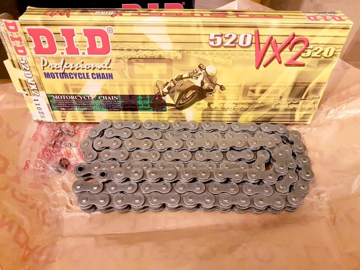 v) 520er Kettensatz aus DID Kette (VX2; X-Ring) und passendem Alu-Kettenrad (Kombinationen möglich).