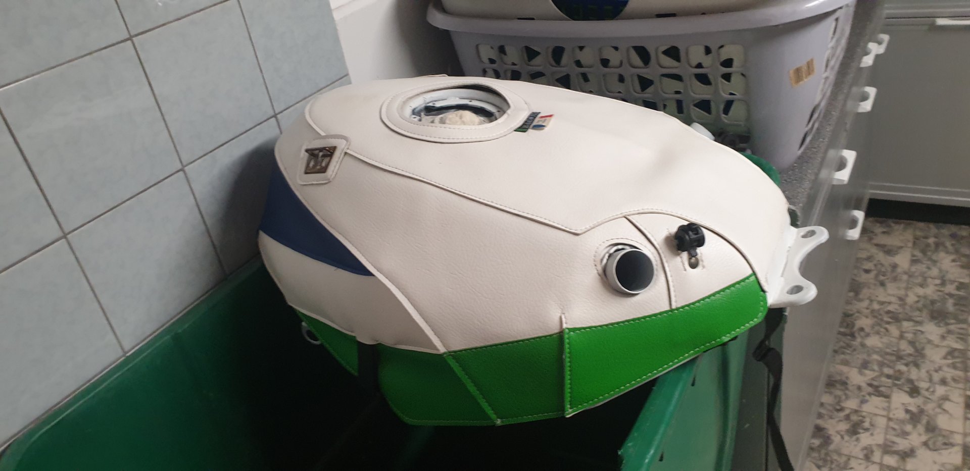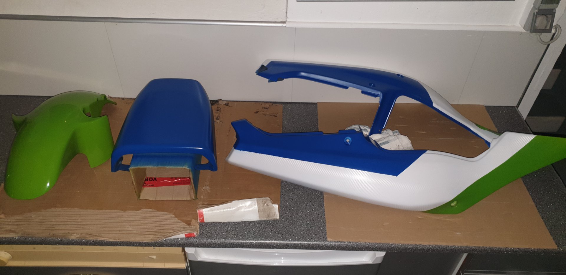 bin auch schon etwas weiter.Das ehemalig Schwarz gerollte Moped bekommt langsam wieder ihre Farbe zurück.Hab bei Ebay für 49Euro einen Italienischen Bagster geschossen, war noch neu verpackt.Die Seitenteile kommen morgen dran...