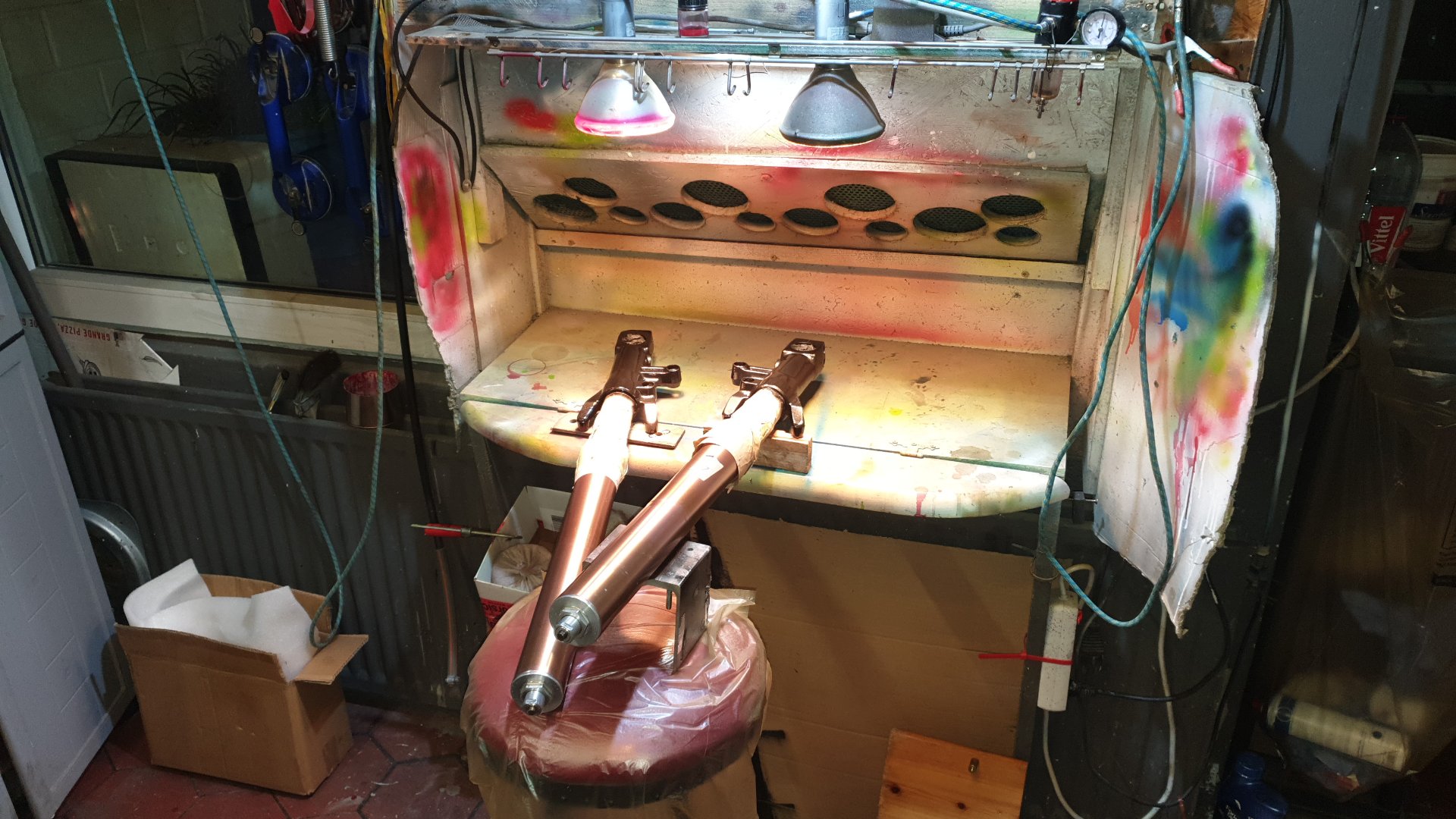 Also fast 3 Std geschliffen von 400 Korn bis 2000 Korn anschliessend poliert und wieder zusammengebaut.Einstellung 6ter Ring von oben und die kleine Schraube erst kommplett raus, dann 5 klicks nach links.( ob das richtig ist weiss ich nicht) Aber so federten beide gut.Dann Lack.