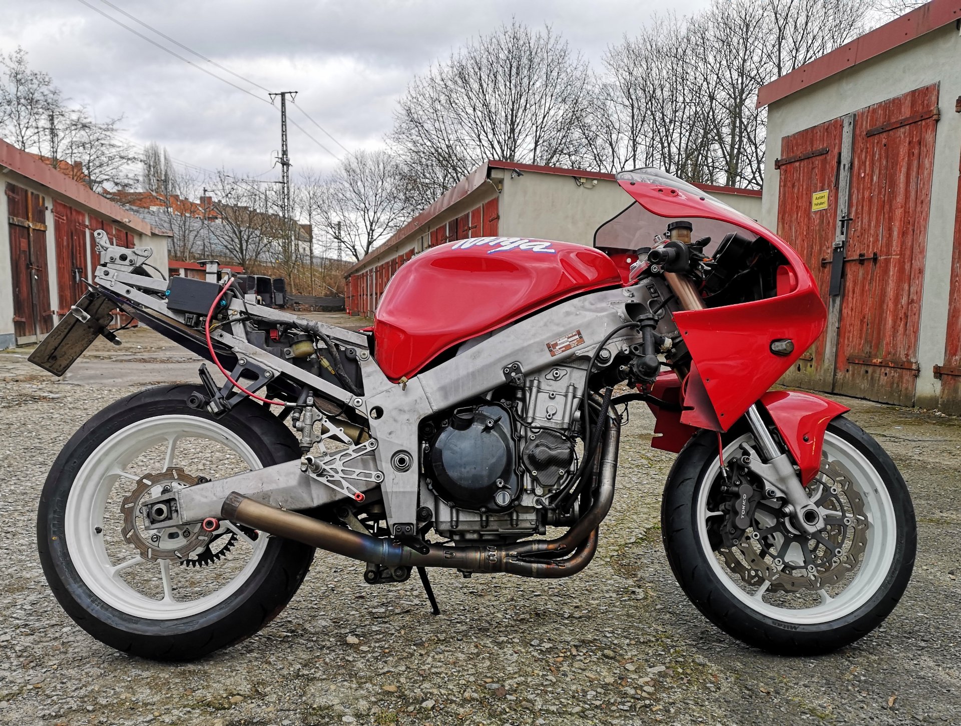 Der Motor aus der weißen 7er ist drin (seit 3 Jahren aber nie gestartet 🙈), die RSV4 Felgen mit den selbst gedrehten Distanzen aber die Gabel wird noch getauscht.