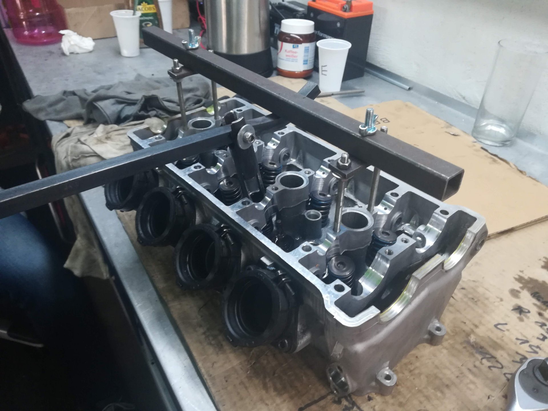 Ich behaupte sogar, dass man mit meiner selbst gebauten Brücke zum Ventile ausbauen auch ohne Kopfdemontage die Dichtungen wechseln kann.