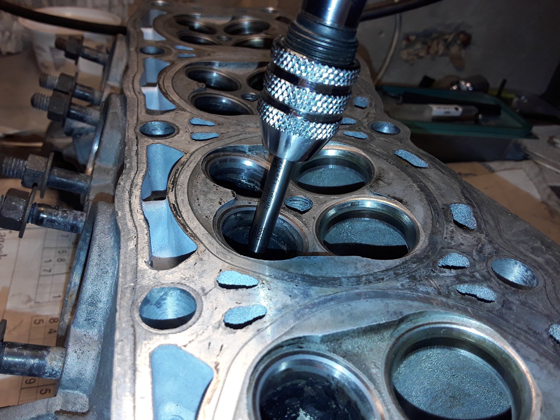 Bei mir waren die Auslassführungen nur am Ende zum Kanal hin im mittleren Toleranzbereich geweitet, etwa auf 4,54. Und zwar stärker in Längsrichtung, wahrscheinlich durch die Schlepphebel. Also eigentlich noch gut in der Toleranz bis 4,58. Den Kippeltest von dem Profi Frank hier aus dem Forum haben sie aber nicht mehr so eindeutig bestanden, daher habe ich das an meinem Ersatzzylinderkopf mal probiert.