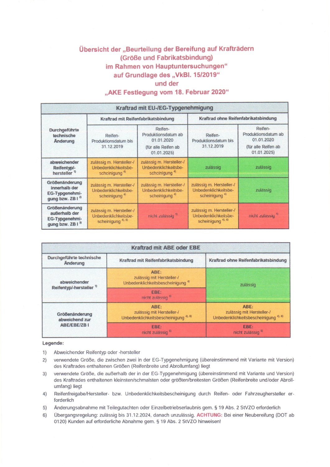 Im Verkehrsblatt 15-2019 vom 15.08.2019 wurde die Praxis der Reifenumrüstung an Motorrädern neu festgelegt. Daraus resultiert, dass bestehende Bereifungsempfehlungen oder Unbedenklichkeitsbescheinigungen nicht länger als alleiniger Nachweis über eine gefährdungsfreie Montage bei abweichender Dimension oder Bauart herangezogen werden können.