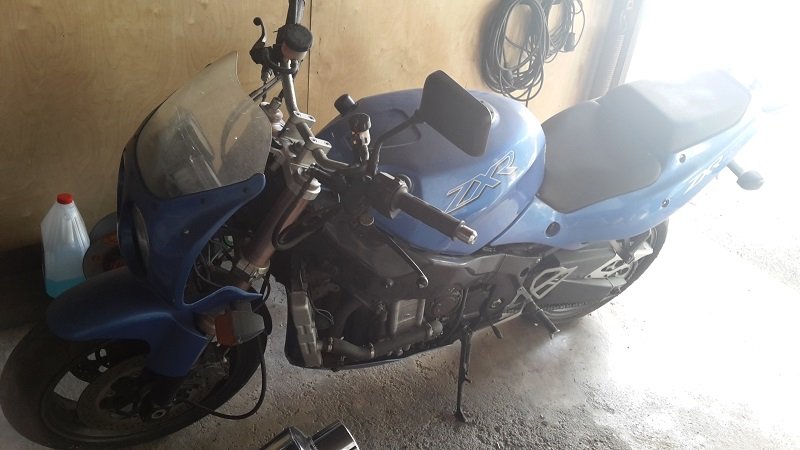 vor zwei Tagen haben Benny und ich uns spontan ein gemeinsames Wiederaufbauprojekt geangelt. Bei einem Händler im Nachbarort fanden wir eine blaue Jott in relativ verwahrlostem Zustand und konnten das arme Geschöpf dann nicht einfach seinem Schicksal überlassen... Gestern ist die Jott, getauft auf den Namen Erika, dann schon bei unseren beiden anderen ZXRen eingezogen. Das ganze gleicht eher einem Scheunenfund, da sie im Freien in einem überdachten Verschlag gestanden ist. Sie hat nun 72 000 km auf der Uhr und ist seit 8 Jahren stillgelegt. Kleine Vorwarnung - der wahre Zustand ist wesentlich übler als er auf den folgenden Bildern erscheint :oo: