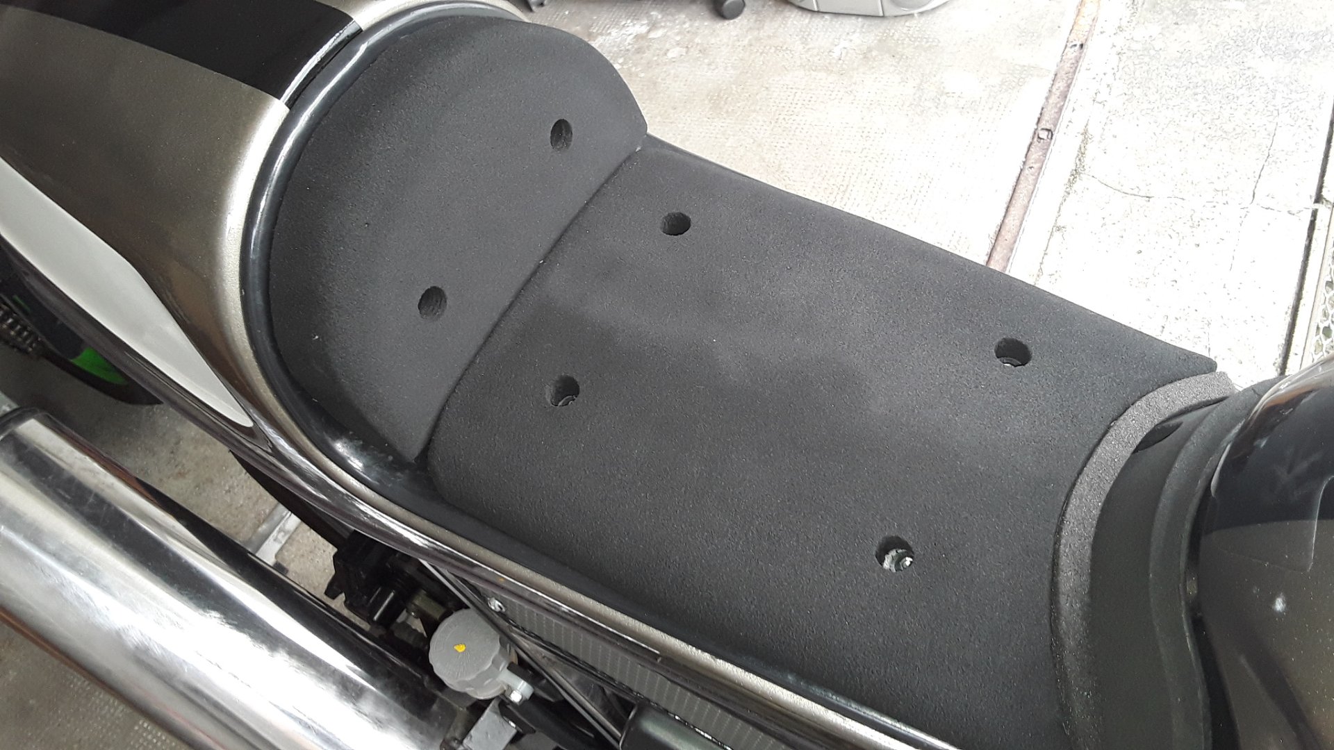 Überlege einen Gebrauchtsitz abzupolstern und ebenfalls Neopren zu bekleben, mit etwas weniger Gefälle und weichem Übergang zum Tank.
